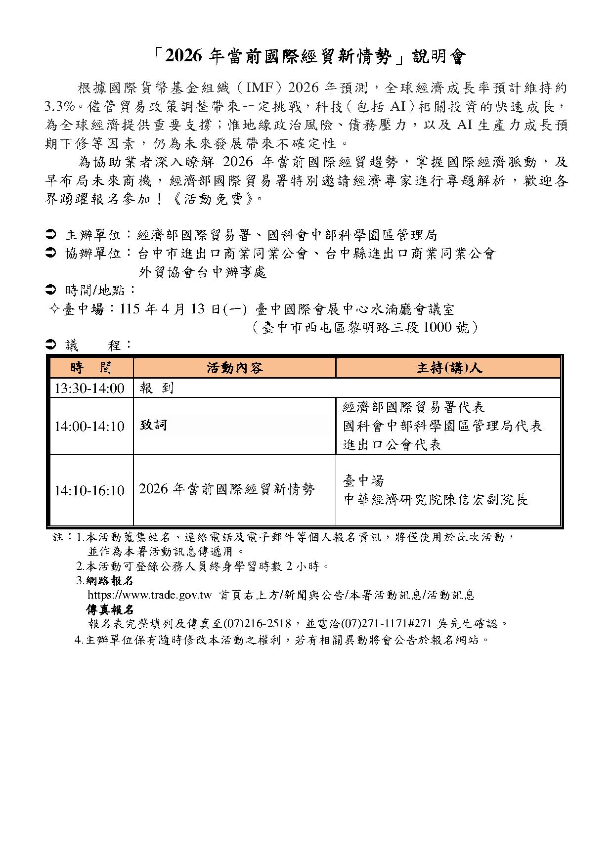 標題: 「2026年當前國際經貿新情勢」說明會(4/13臺中場)