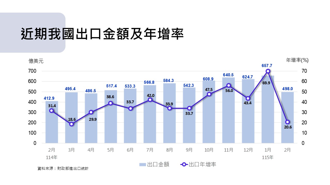 1.出口:2月出口498.0億美元,年增率20.6%。