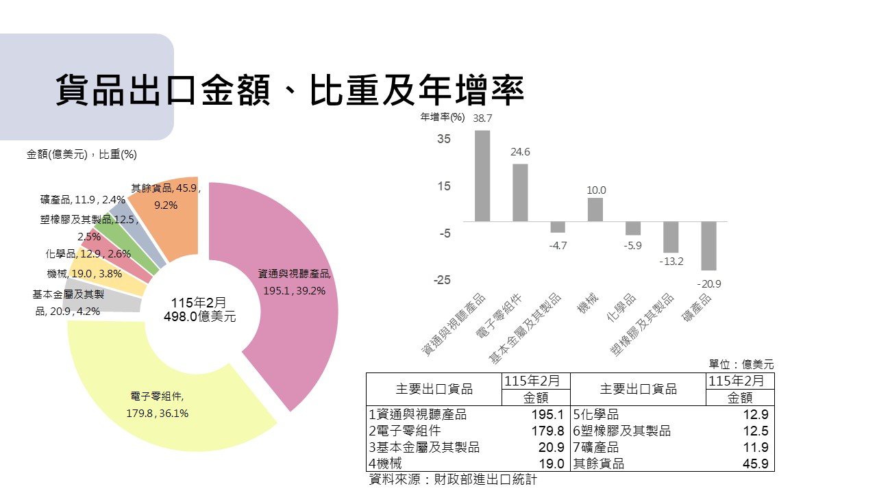 2月出口貨品以資通與視聽產品195.1億美元金額居冠(占比39.2%),增幅38.7%,其次為電子零組件179.8億美元(占比36.1%),增幅24.6%。