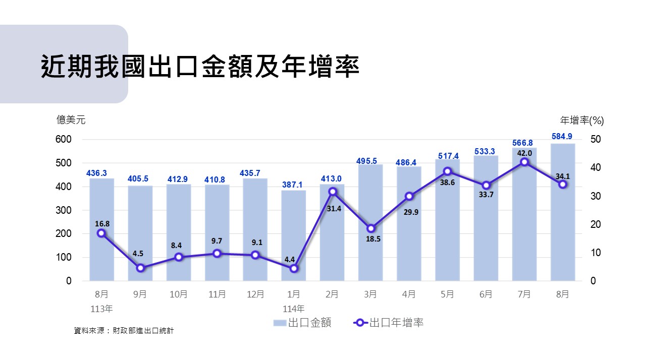 1.出口:8月出口584.9億美元,年增率34.1%;累計1-8月出口3,984.3億美元,年增率29.2%。
