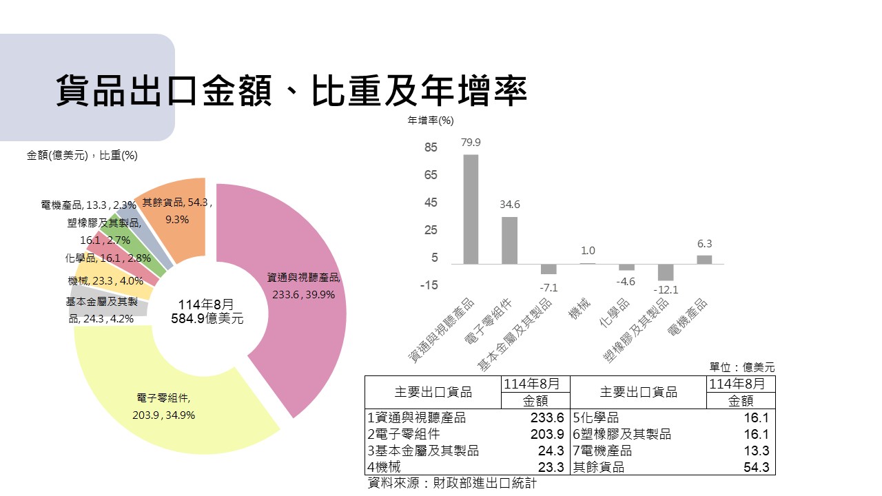 8月出口貨品以資通與視聽產品233.6億美元金額居冠(占比39.9%),增幅(79.9%)最大,其次為電子零組件203.9億美元(占比34.9%),增幅(34.6%)亦居次。.JPG&cache=31536000)