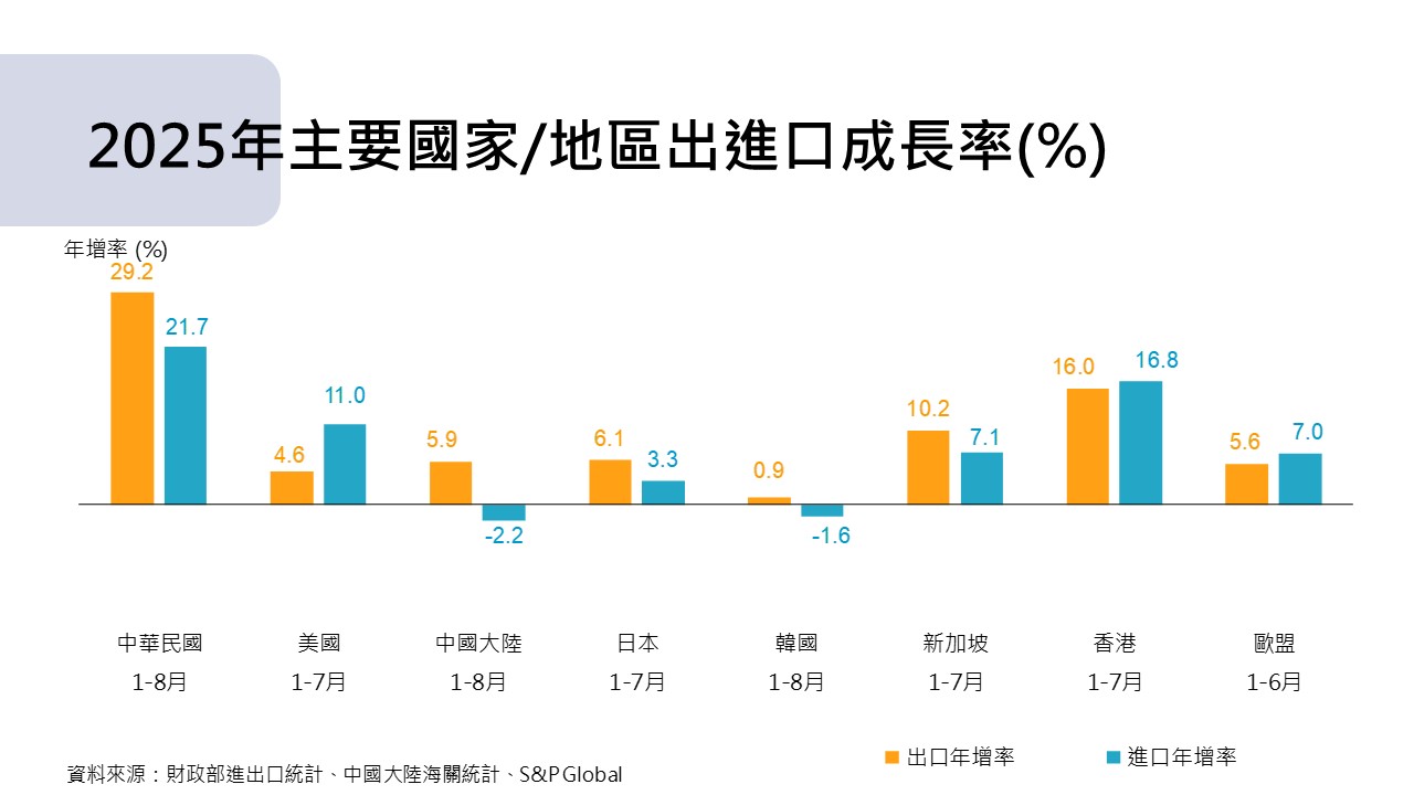 1.出口成長率:2025年我國29.2%(1-8月),主要國家/地區分別為香港16.0%(1-7月)、新加坡 10.2%(1-7月)、日本6.1%(1-7月)、中國大陸5.9%(1-8月)、美國4.6%(1-7月)及韓國0.9%(1-8月)。