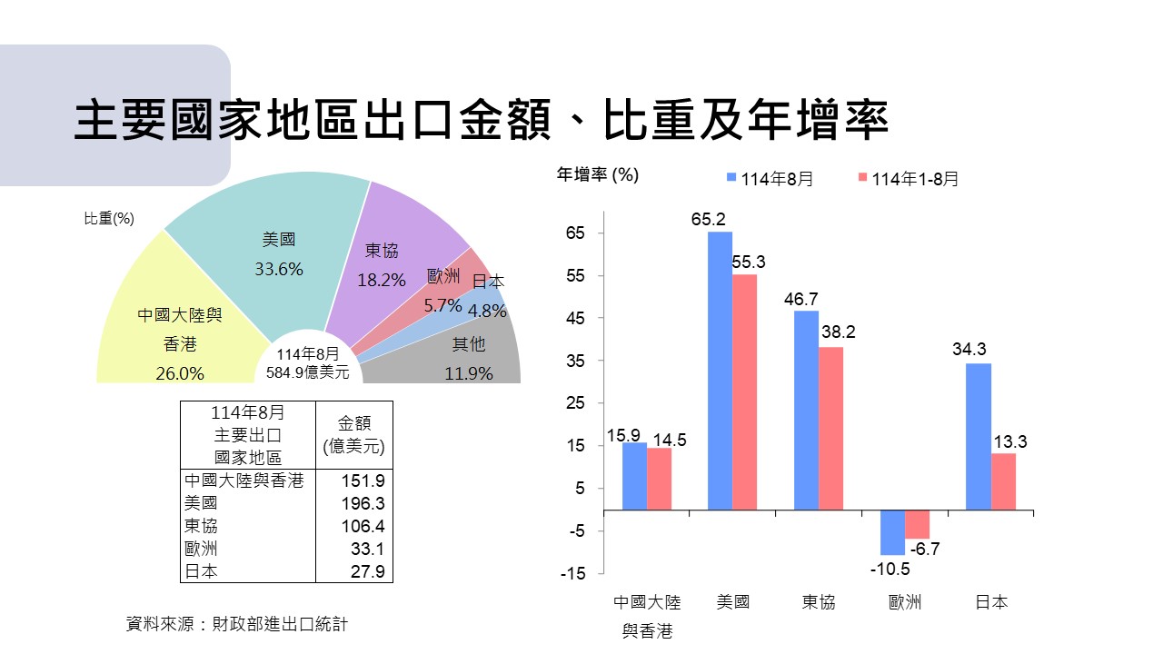 8月對五大市場出口年增率分別為美國65.2%、東協46.7%、日本34.3%、中國大陸與香港15.9%及歐洲-10.5%。.JPG&cache=31536000)
