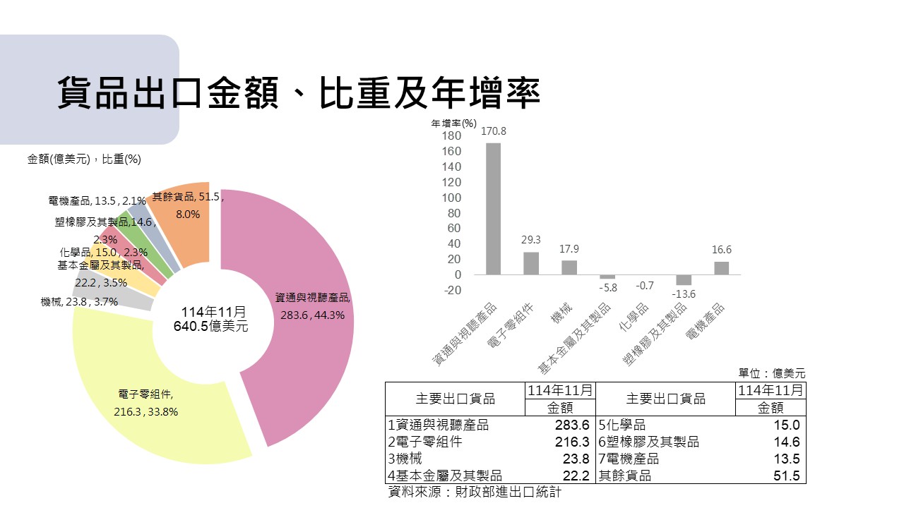 11月出口貨品以資通與視聽產品283.6億美元金額居冠(占比44.3%),增幅170.8%,其次為電子零組件216.3億美元(占比33.8%),增幅29.3%。.JPG&cache=31536000)